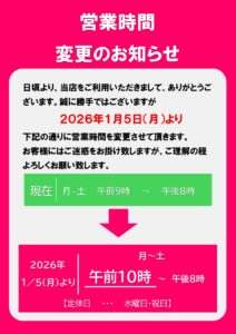 誠に勝手ながら、2026年1月5日(月)より、有人営業時間を下記の通り変更させていただきます。