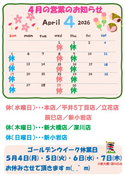 2026-04-12 / 最終更新日時 : 2026-04-12 いすずクリーニング田郡 お知らせ 4月の営業のご案内 いつも当店をご利用いただき誠にありがとうございます。 4月の営業カレンダーです。 4月も皆さまのご来店をお待ちしております。